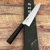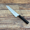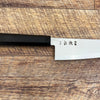 The Kiritsuke has become very popular in the past few years as the drop tip tappers down to a very thin scalpel and is an aggressive work horse. They generally come in a few sizes ranging from 210mm to 240mm. Traditionally a kiritsuke is a single-beveled and combined with the rustic geometry, makes the kiritsuke look like an epic kitchen sword. This is used for slicing up large cuts of meat and fish it will give you a clean cut finish