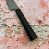 SG2 (R2) is a high speed powder stainless steel made by Takefu special steel Co Ltd. For some knife makers, this is an ideal steel for knife making as it has a great hardiness of greater than 63HR. This steel has great edge retention, high wear resistance and is stainless. The grains are so fine and uniform that the hammer forging is not necessary. The black colour of the kurouchi finish is burned steel, which gives it a matt black finish and is very distinctive. The kurouchi finish can change over time as the black layer will wear away. The word tsuchime means “hammered” and that’s how this finish is achieved. After the blade has been forged, it will go through a second hammering process with something like a ball-peen hammer to give the distinctive round dimples.