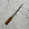 The petty knife is light and thin with a bit of flex to it and is used for peeling, chopping and trimming. Not used in a hammer grip way meaning you don’t chop up and down like a chefs knife due to not having enough clearance for the knuckles. Mostly used for cutting away from the chopping board but is essential for any knife roll and home kitchen. The general size of a petty ranges from 95mm to 150mm but can go up to 180mm but this is considered to be in a slicing categories.