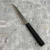 The Petty knife is light and thin with a bit of flex to it and is used for peeling, chopping and trimming. Not used in a hammer grip way meaning you don’t chop up and down like a chefs knife due to not having enough clearance for the knuckles. Mostly used for cutting away from the chopping board but is essential for any knife roll and home kitchen. The general size of a petty ranges from 95mm to 150mm but can go up to 180mm but this is considered to be in a slicing categories.