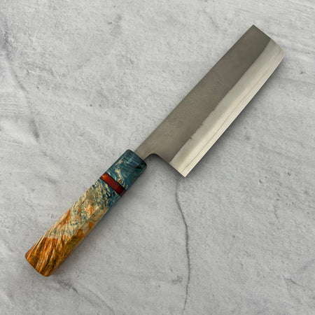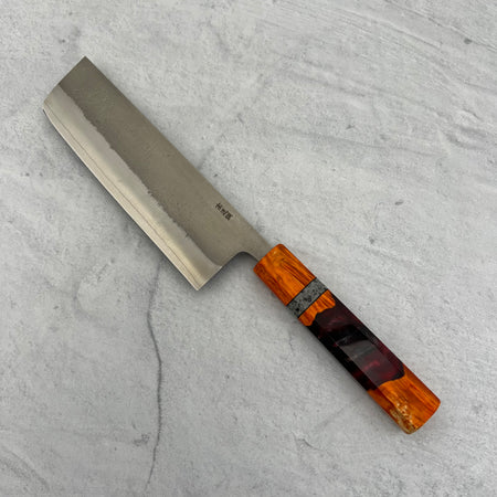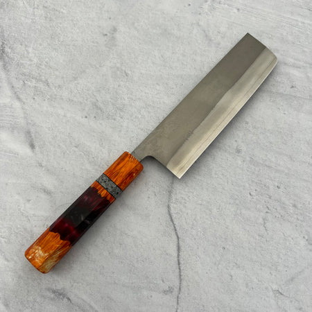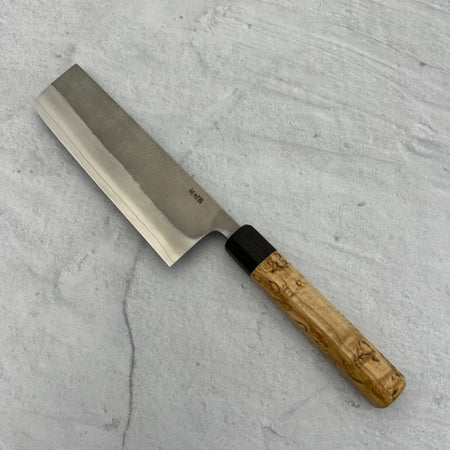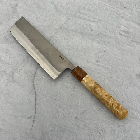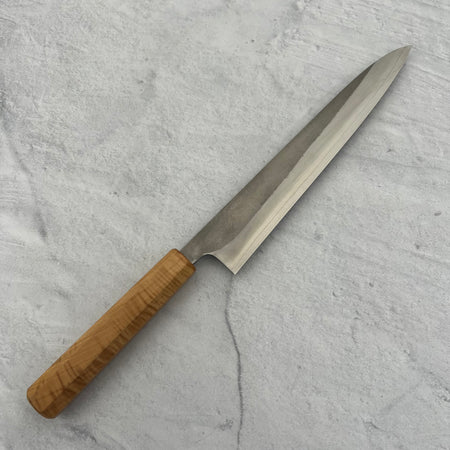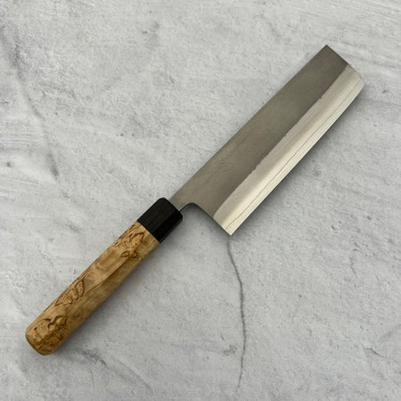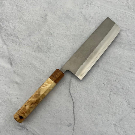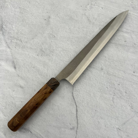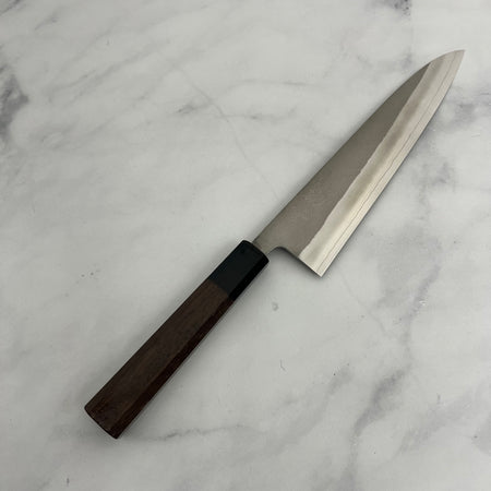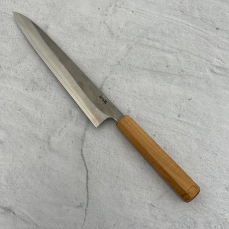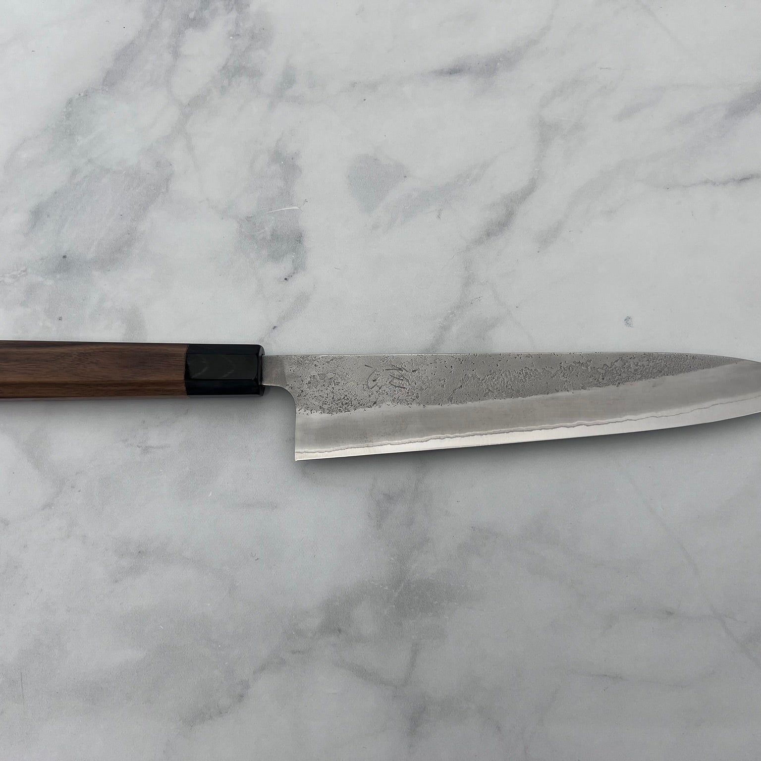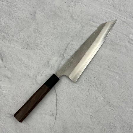 Yoshikane knives are celebrated for their exceptional blade geometry, featuring slight convex grinds and a superb fit and finish. The workshop utilizes high-quality steels such as Shirogami #2 (White #2) carbon steel and SKD semi-stainless tool steel, often with stainless cladding to enhance durability and ease of maintenance. The Nashiji (pear skin) finish is a distinctive aesthetic feature of many Yoshikane knives, providing a rustic yet refined appearance.